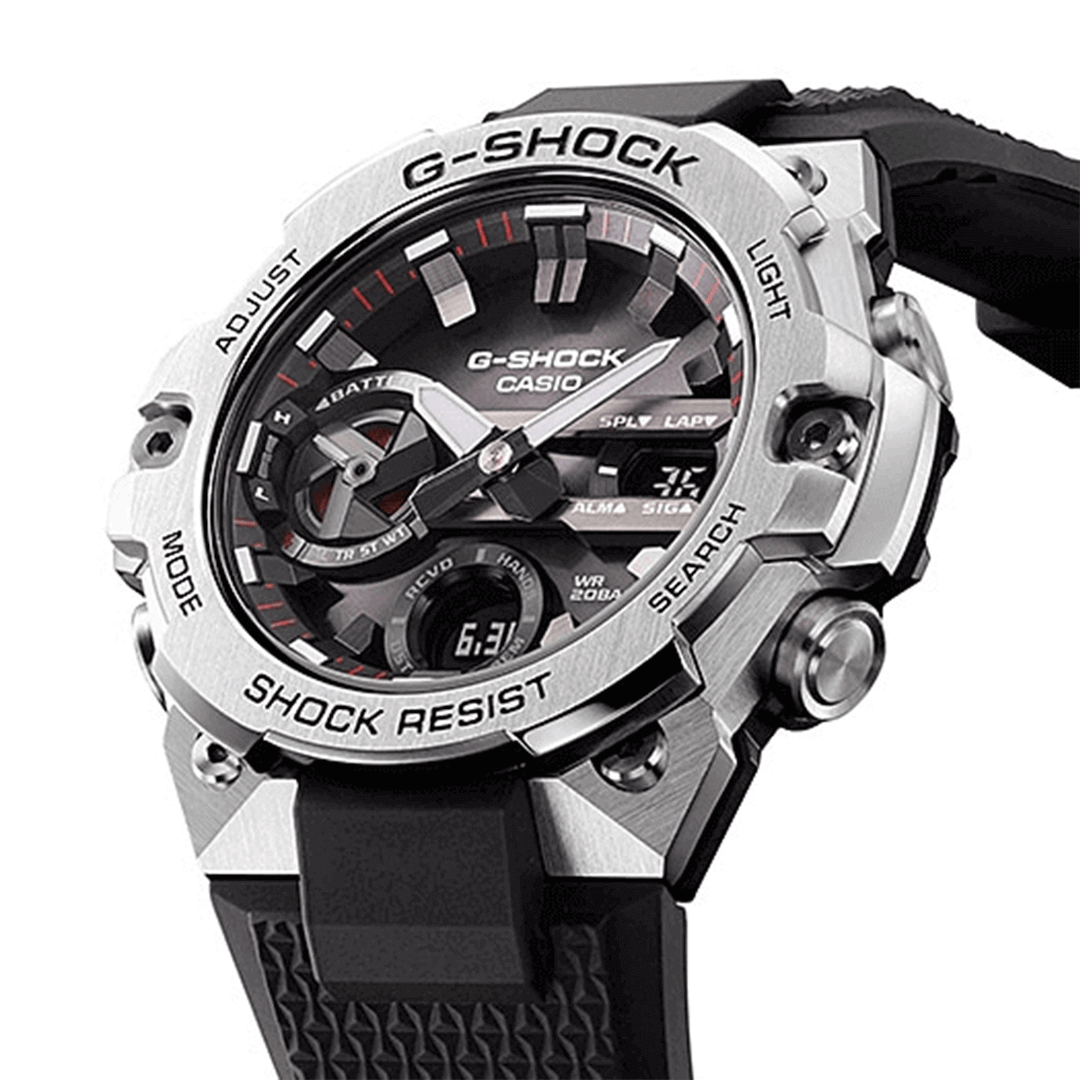 G-Shock Watch G-Steel Bluetooth Mens GST-B400-1AER. Introducing new color variations to the lineup of slim G-STEEL GST-B400 models with new, improved designs made possible by a thin module and carbon core guard structure. There is a standard model in this lineup, the GST-B400 with silver color face and resin band.