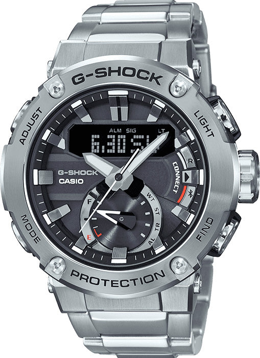 G-Shock Watch G-Steel Bluetooth Smartwatch GST-B200D-1AER. Carbon Core Guard structure. The case is made of fine resin that incorporates carbon fiber for light weight along with rigidity that is superior to that of resin. This material protects the internal module from shock induced damage and deformation. The dual back cover protects the back surface against impact. The small case of the GST-B100 series base model provides a comfortable fit, even though the watch is equipped with a wide face.