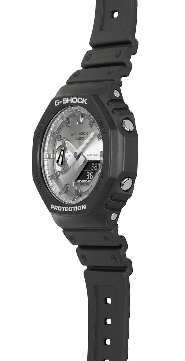 G-Shock Watch GA-2100 Octagonal Mens GA-2100SB-1AER. Introducing the addition to the legendary octagonal family, featuring a popular black and metallic design. The GA-2100 inherits the iconic octagonal form of the first G-SHOCK with a digital-analog combination that maintains the same tough construction but in an even slimmer profile, at just 11.8 mm. A head-turning timepiece with a striking matte finish and silver dial, bound to be noticed.
