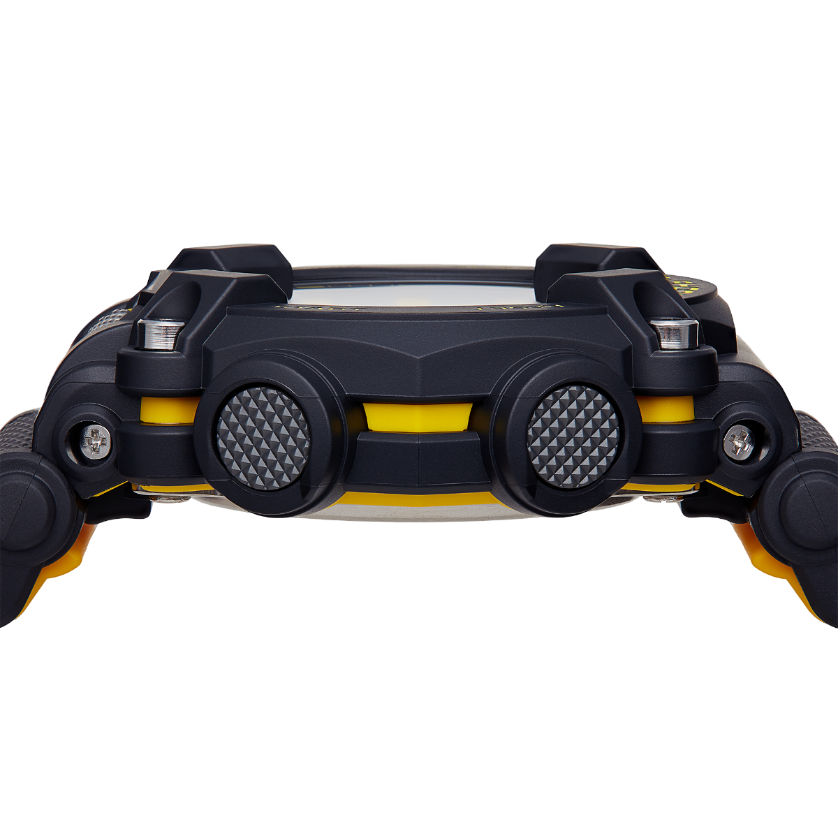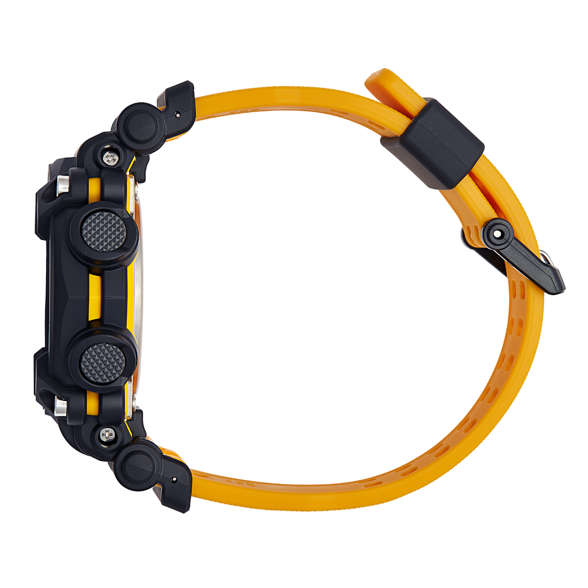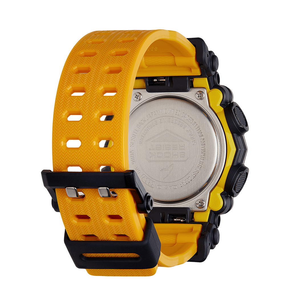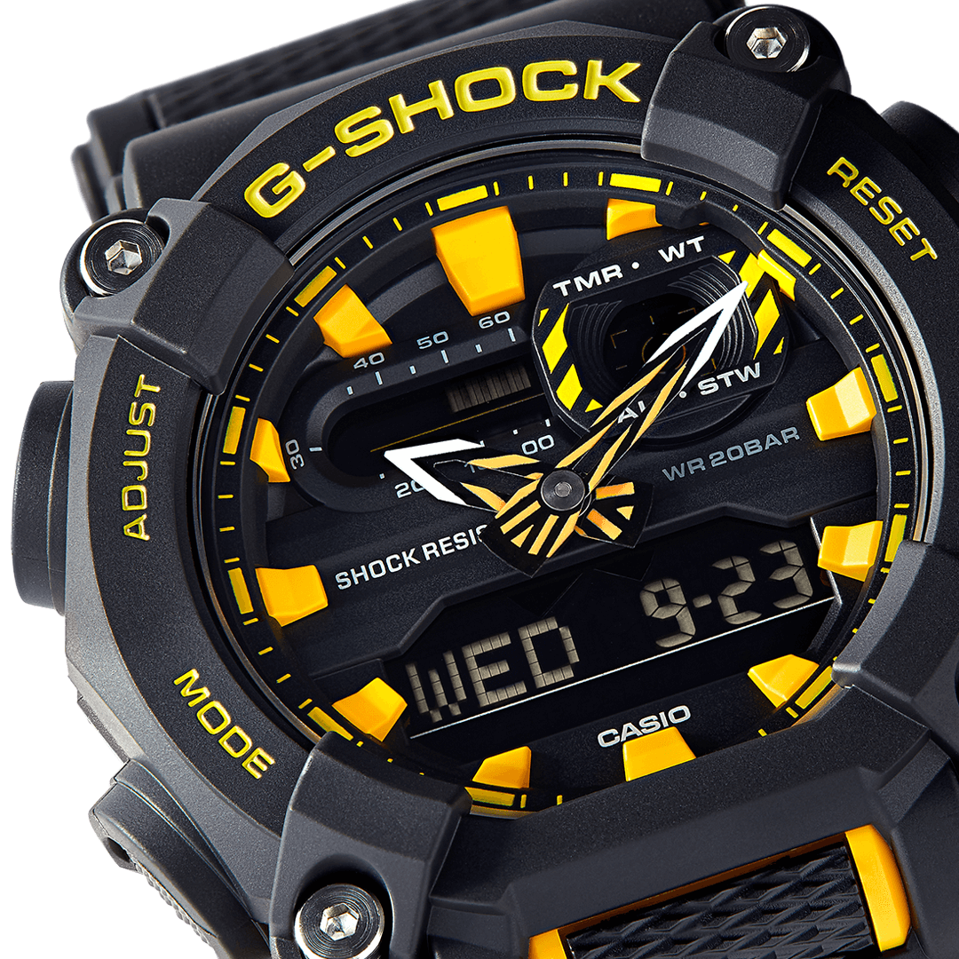 G-Shock Watch Heavy Duty GA-900A-1A9ER. The heavy duty models that are great for wear in tough environments and as street fashion items as well. The GA900A 1A9 model comes with a yellow resin band. The industrial design of these models is created by a 10 sided bezel that resembles the shape of a nut. The bezel is secured by four screws for a tough and rugged look. Combination timekeeping is provided by analog hands along with a digital display for the ultimate in operational ease. The design of the hands and the graphic figures that appear in the digital readouts create a powerful face design that enhances readability. The band connection and all buttons have checkered surfaces that prevent slipping and contribute to operational efficiency.