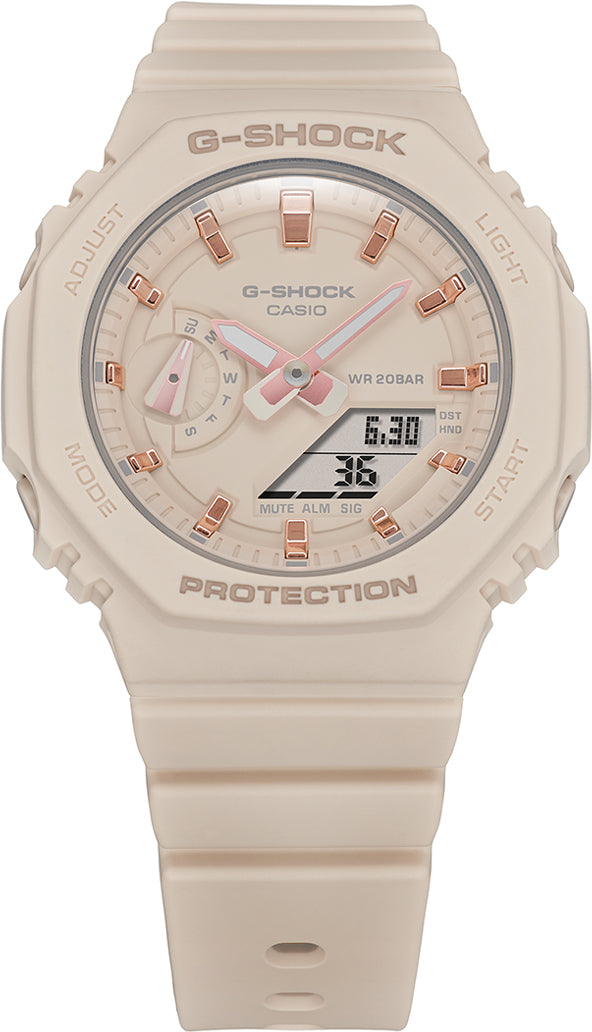 G-Shock Watch Mini CasiOak GMA-S2100-4AER. The timepieces became equipped with various functionalities, which made them excellent for athletes, adventurers and military personnel. G-Shock watches feature atomic timekeeping, resistance to dust and cold.