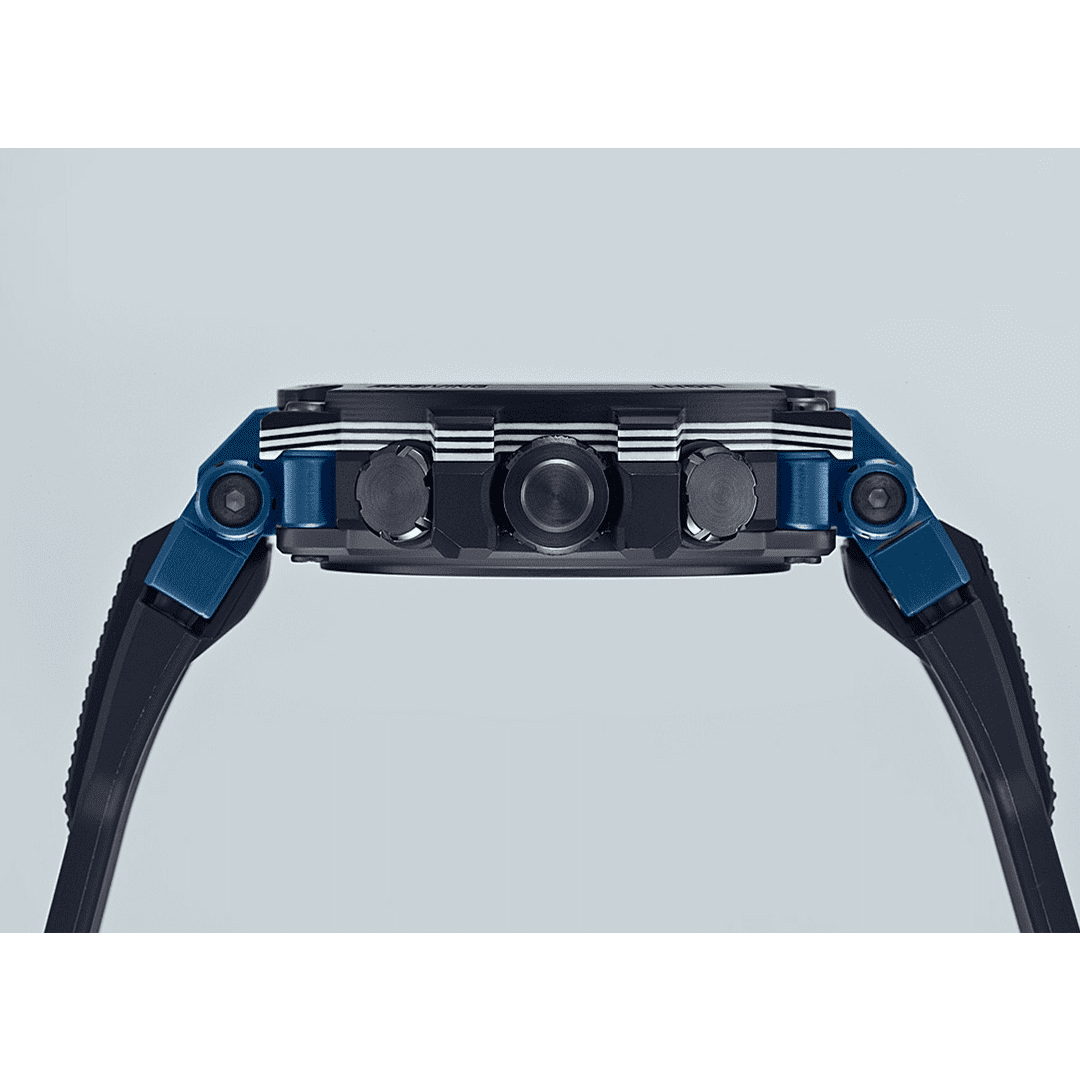 G-Shock Watch MR-G Bluetooth Smart Slimline MTG-B1000XB-1AER. This uniquely intricate timepiece intertwines the construction of strength with visual impact. Through alternating layers of blue coloured glass, a resulting striped pattern is created on the side of a woven imprinted carbon bezel attached to a soft urethane band. Additional features include Bluetooth connectivity and scratch resistant sapphire glass. Presented in a smaller than ever size, the MTG-B1000XB is lighter and better fitted to your wrist.