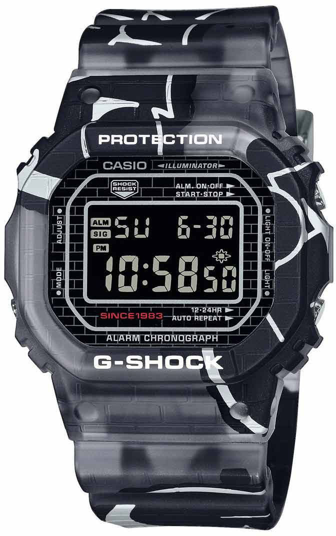 G-Shock Watch Street Spirit DW-5000 DW-5000SS-1ER. Take it to the streets with original graffiti art for your wrist. Introducing the Street Spirit line of watches that takes the G-SHOCK form as its canvas. Splashed boldly across the bezel and band, these street-savvy designs deliver original graffiti art that crushes in any fashion scene. Choose the iconic DW-5000 with its toned down colour palette of greys while still maintaining all the functions and feature you expect from a G-SHOCK.