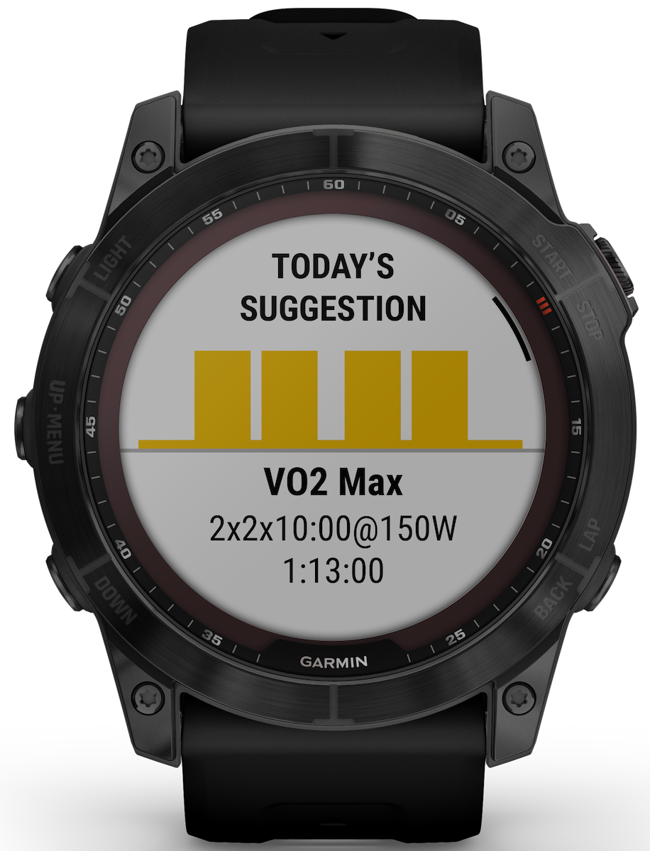 - Training, Planning & Analysis Features: HR zones, HR alerts, HR Calories, % HR max, %HRR, Recovery time, Auto Max HR, HRV Stress Test, HR Broadcast, Respiration Rate, GPS speed and distance, Customisable screens, Customisable activity profiles, Auto pause, Interval training, Advanced workouts, Downloadable training plans, Power Modes, Auto Lap, Manual lap, Configurable lap alerts, Heat and altitude acclimation, VO2 Max, Training Status, Training Load, Training Load Focus, Training effect (aerobic), Training effect (anaerobic), Primary Benefit, Improved Recovery Time, Daily Suggested Workouts, Customisable alerts, Audio prompts, Finish time, Virtual partner, Race an activity, Auto multisport activities, Multi-sport, Course Guidance, Garmin live segments, Strava live segments, Round Trip Course Creator, Trendline Popularity Routing, Touch and/or button lock, Hot keys, Auto scroll, Activity history on watch, Physio TrueUp