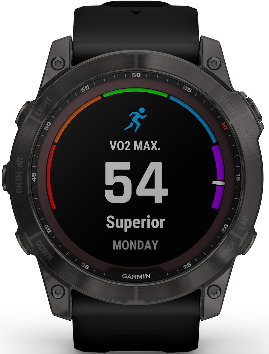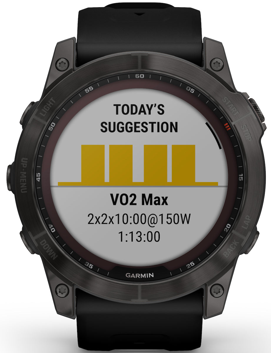 - Training, Planning & Analysis Features: HR zones, HR alerts, HR Calories, % HR max, %HRR, Recovery time, Auto Max HR, HRV Stress Test, HR Broadcast, Respiration Rate, GPS speed and distance, Customisable screens, Customisable activity profiles, Auto pause, Interval training, Advanced workouts, Downloadable training plans, Power Modes, Auto Lap, Manual lap, Configurable lap alerts, Heat and altitude acclimation, VO2 Max, Training Status, Training Load, Training Load Focus, Training effect (aerobic), Training effect (anaerobic), Primary Benefit, Improved Recovery Time, Daily Suggested Workouts, Customisable alerts, Audio prompts, Finish time, Virtual partner, Race an activity, Auto multisport activities, Multi-sport, Course Guidance, Garmin live segments, Strava live segments, Round Trip Course Creator, Trendline Popularity Routing, Touch and/or button lock, Hot keys, Auto scroll, Activity history on watch, Physio TrueUp
