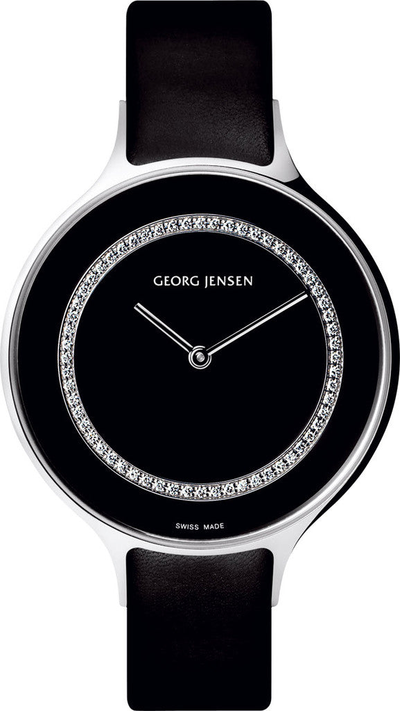 Georg Jensen Watch Concave 316. CONCAVE the dial and case are completely integrated into one form CONCAVE watches celebrate subtle shaping With a black calfskin strap and black watch face adorned with a single row of sixty brilliant diamonds one for each minute the CONCAVE watch is a dramatic presence. The dial and the watch case are fused seamlessly into a single concave form. Upon close inspection, every element of this timepiece is concave from the crystal to its hands, each part follows the subtle sloping architecture that inspired CONCAVES design. Darkly sensual, delicately built.