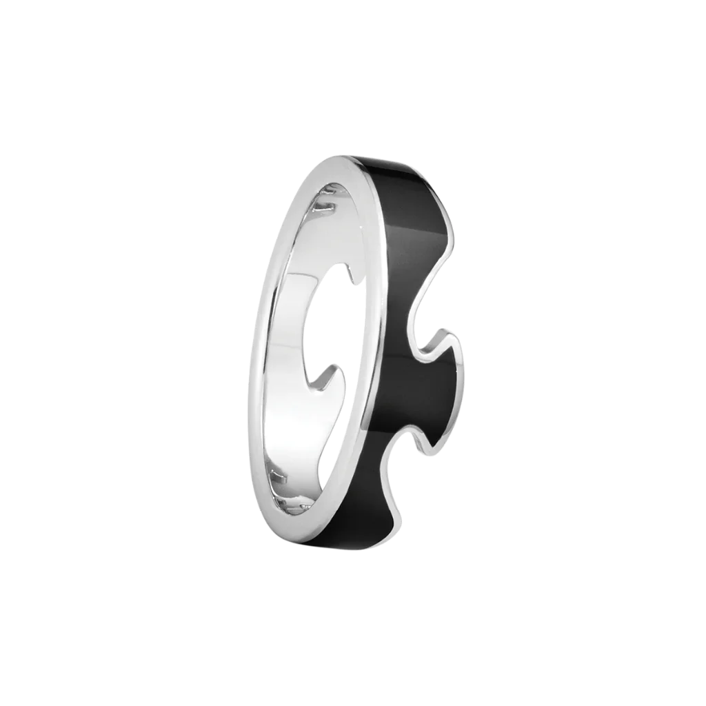 The iconic Georg Jensen Fusion collection allows you to combine different rings to craft a true personal signature. This end ring in 18kt white gold boasts a refined black hue achieved through meticulous jewellery-making techniques, a feat achievable only by Georg Jensen's most skilled artisans. The coloured material is a superior hybrid compound of ceramic and polymer lacquer, ensuring the utmost quality. The piece is based on the original design by Nina Koppel.