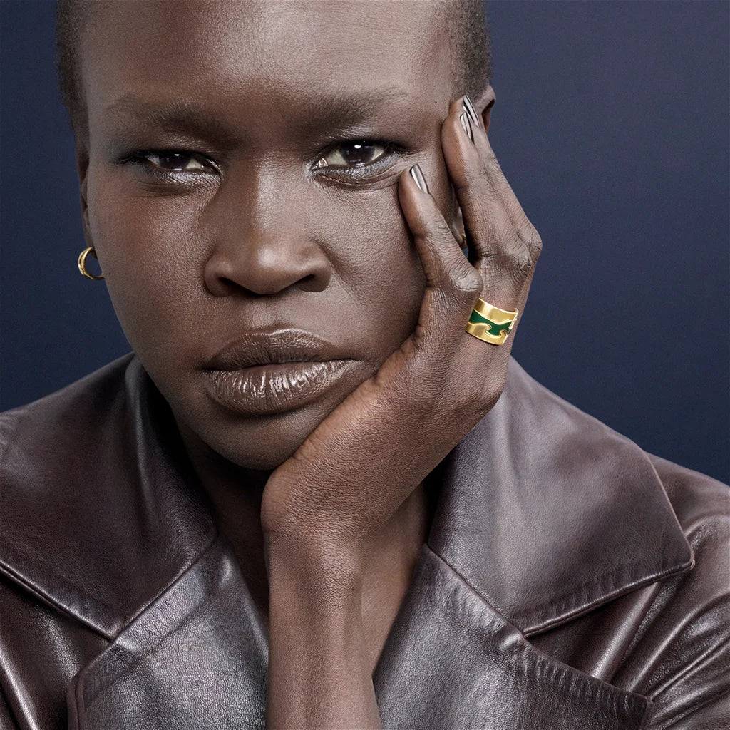 The iconic Georg Jensen Fusion collection allows you to combine different rings to craft a true personal signature. This centre ring in 18kt yellow gold boasts an emerald green hue, inspired by the textile designs of Nina Koppel, who first envisioned the Fusion ring in the 1990s. The colour of the ring is achieved through meticulous jewellery-making techniques, a feat achievable only by Georg Jensen's most skilled artisans. The coloured material is a superior hybrid compound of ceramic and polymer lacquer, ensuring the utmost quality. The piece is based on the original design by Nina Koppel.