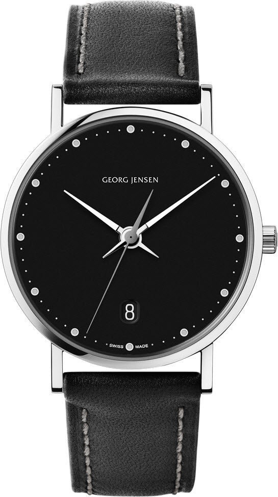 Georg Jensen Watch Koppel 421. The Koppel collection introduces the Slim Line models with a slender case design, a timeless black dial. Fitted with a high quality black calfskin strap with a discreet pin buckle, the new Koppel Slim Line offers a case diameter of 32 millimetres and a slender case that is thinner than the new Koppel Gent Chronograph and Dual Time.