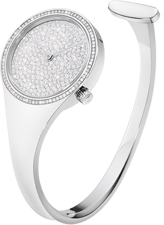 Georg Jensen Watch Vivianna 27mm Quartz 3575651. The Vivianna Bangle is an icon, seamlessly blurring the line between horology and jewellery. Numberless, strapless, mirrored, its complete lack of distracting adornments is a singular departure from the expected. It was ever the designers intention to create a watch that liberates the wearer from the convention of time. Viviannas flawless minimalism is at once sensual and tactile. With no apparent beginning or ending, it exemplifies Vivianna Toruns ability to mould flexible, sculptural forms from seemingly solid materials. This aesthetic is further enhanced by the open ended design to give the impression that the Bangle floats above the wrist, the ultimate symbol of elegance, femininity and eternity.