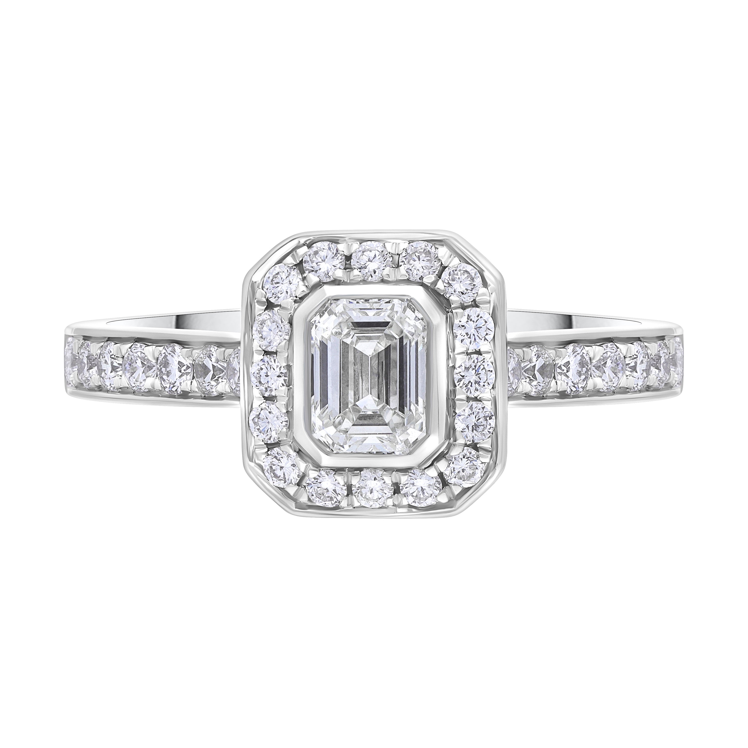 An embodiment of elegance and luxury, this breathtaking engagement ring boasts an emerald cut diamond surrounded by an array of smaller cut diamonds, totalling 0.59 carats, set on a classic platinum band. Designed perfectly for everyday wear, this diamond set piece would make the perfect engagement ring to sit comfortably alongside a wedding band.