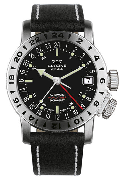 Glycine Watch Airman 17. The most important features of Glycine world time watches of the last decades are combined in the pilot watch AIRMAN 17. Notable about this 17th AIRMAN generation by Glycine is the technically extensive setting crown at four o'clock: with this the ratchet bezel can be blocked, which makes it particularly easy to set the second and third time zones and guarantees that the set position remains unchanged. The motor element is a movement cal. GL293 finished to perfection. The Airman 17 combines state of the art technology, noble materials and beautiful details.