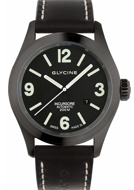 Glycine Watch Incursore 46mm 200M Automatic Sap. Glycines first real oversize watch to trigger the trend towards big time keepers in leading markets. The word Incursore means intruder, and intrusion is properly what this watch produced in many countries. With diameters of 44 to 48mm, strikingly strong looking steel cases, giant steel crowns and big dials, this new watch generation forced its way into the watch market and created a new trend. Their functionality and style live up to the modern criteria for indurial design, while their technical performance is a match for all expectations in military and civil use.