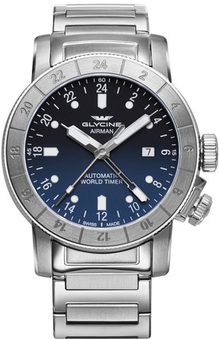 Glycine Watch Airman 44 GL0156. Whenever the subject of aviation comes up, the name of Glycine watches is mentioned as one of the pioneers of watchmaking for pilots and frequent travellers. Beginning in 1953, Glycine started production of the Airman, a watch that became legendary for introducing multiple time zone watches to the market.
