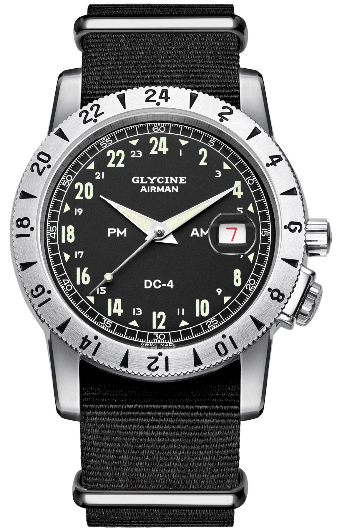 Glycine Watch Airman DC-4 GL0072. The new AIRMAN DC 4 is Glycines way of paying tribute to the DC 4 built by American aircraft manufacturer Douglas Aircraft Company which was, to a great extent, the inspiration for the conception and birth of the legendary pilot watch AIRMAN in 1953. The DC 4 is controlled by an automatic rhodanised GL 293 Swiss movement. Following the purist footsteps of the original AIRMAN, it has an exclusive market position as a 24 hour watch with two time zones. If preferred however, the AIRMAN DC 4 can also be used as a normal 12 hour watch with the additional feature of a 24 hour GMT display on the bezel.