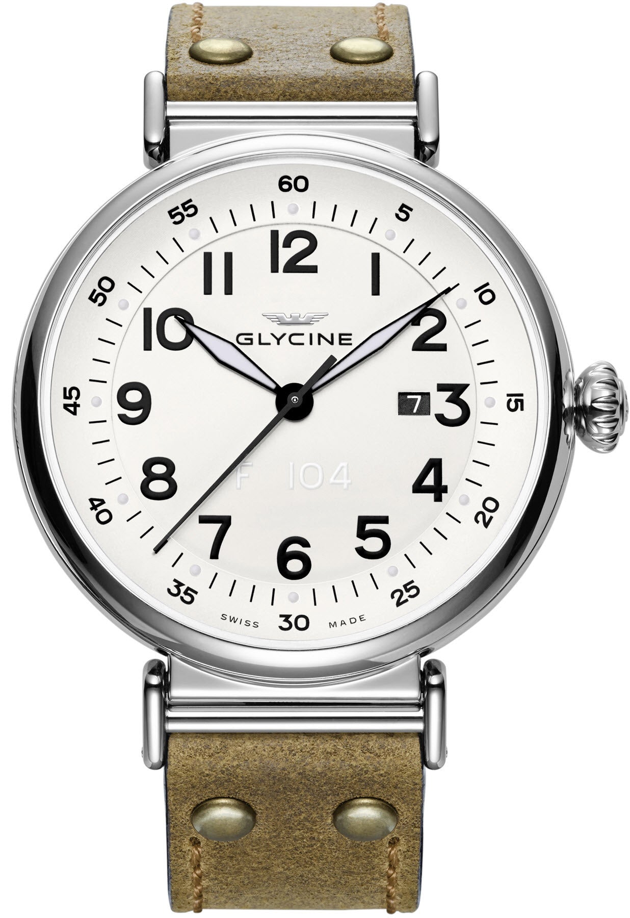 Glycine Watch F104 GL0125. The history and development of Glycine have always been connected with the evolution of aircraft and aviation. Many Glycine watches carry the hallmark of this affinity, such as the Glycine watch F 104. Conceived in the fashion of a cockpit instrument, this extraordinary model impresses by its pure functionality. The watch features a stainless steel case housing a manual wound pocket watch movement. A domed exhibition back attached securely by six screws allows for a full view of the movement. Despite its extraordinary size, the case is ergonomically designed and conforms to any wrist by use of articulated lugs. A pyramid shaped double O ring crown lends an antique look and touch long missing from todays fine timepieces.