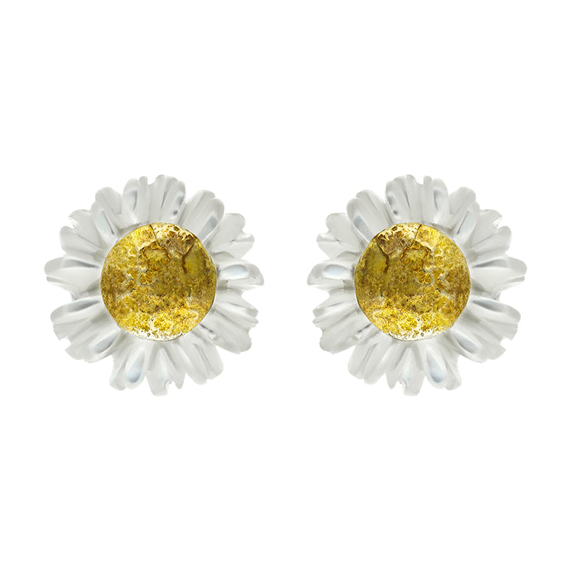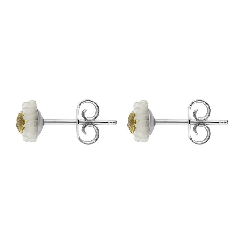 These feminine stud earrings are part of our Tuberose handmade jewellery collection and feature exquisite hand crafted pieces of White Mother of Pearl. The gemstones have been cut and carved in a unique and detailed daisy design, which is accentuated by yellow gold plating to add a touch of colour to the daisies. The earrings are completed with sterling silver hooks, for easy everyday wear.