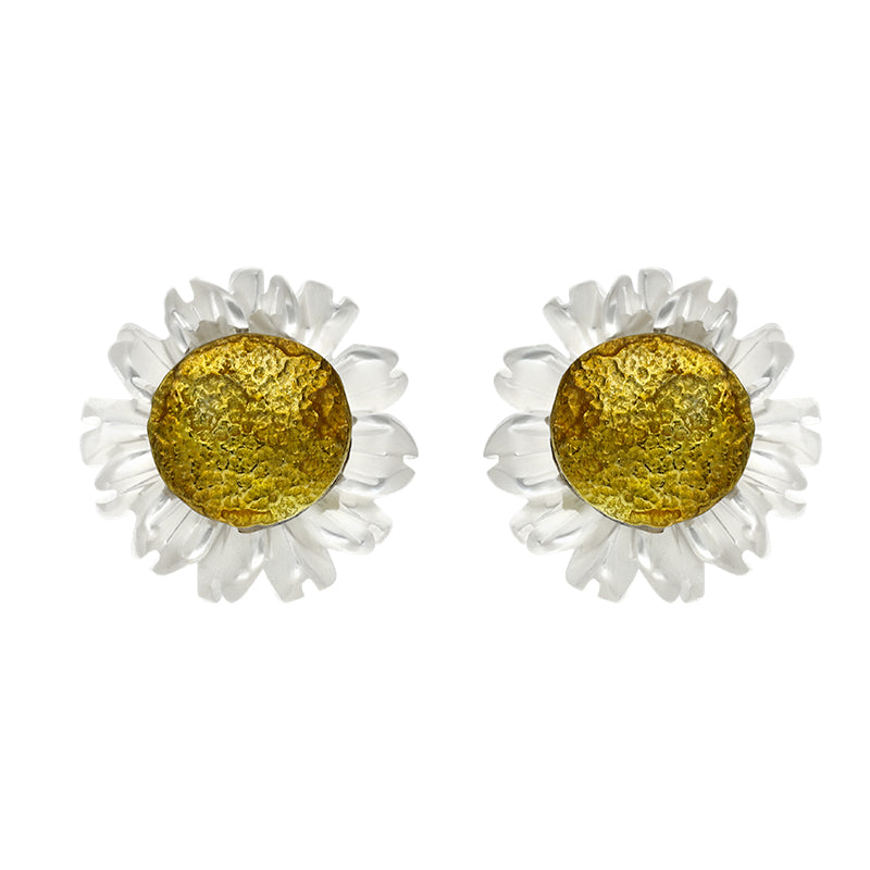 These feminine stud earrings are part of our Tuberose handmade jewellery collection and feature exquisite hand crafted pieces of White Mother of Pearl. The gemstones have been cut and carved in a unique and detailed daisy design, which is accentuated by yellow gold plating to add a touch of colour to the daisies. The earrings are completed with sterling silver hooks, for easy everyday wear.