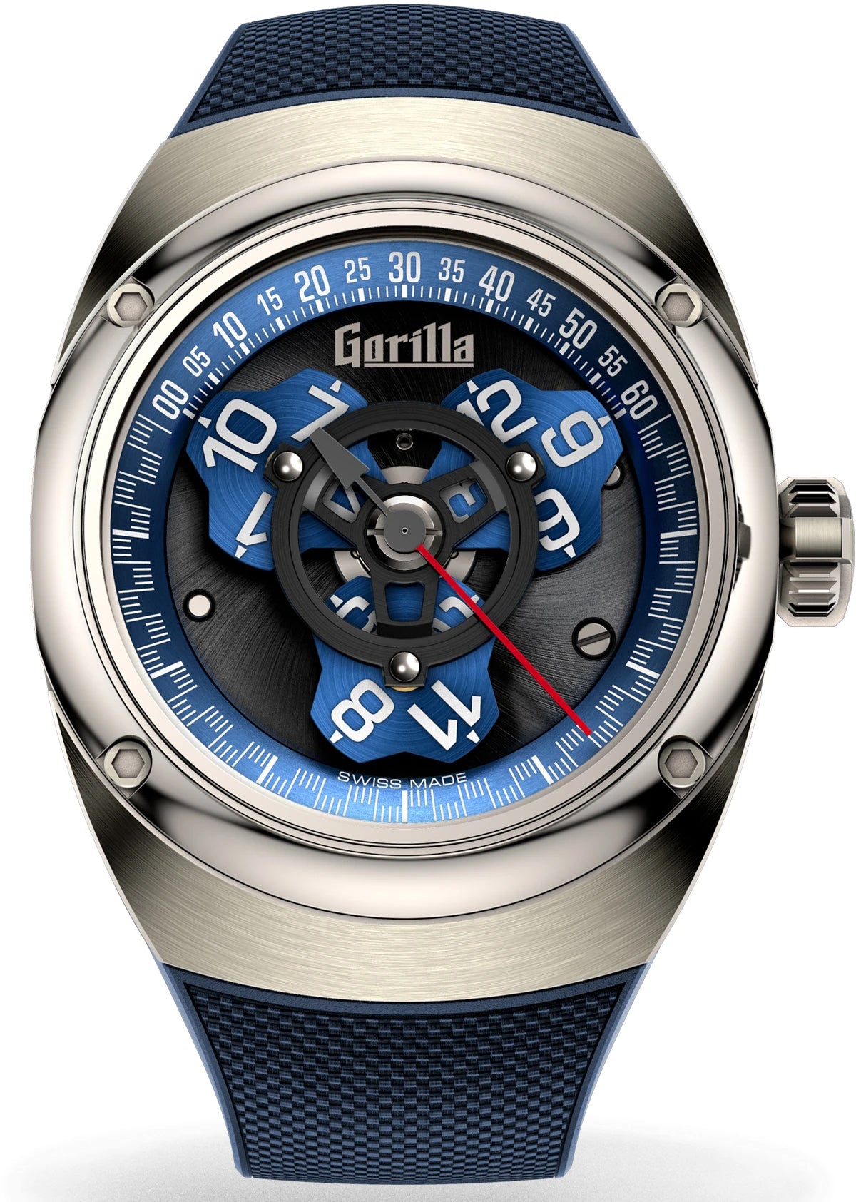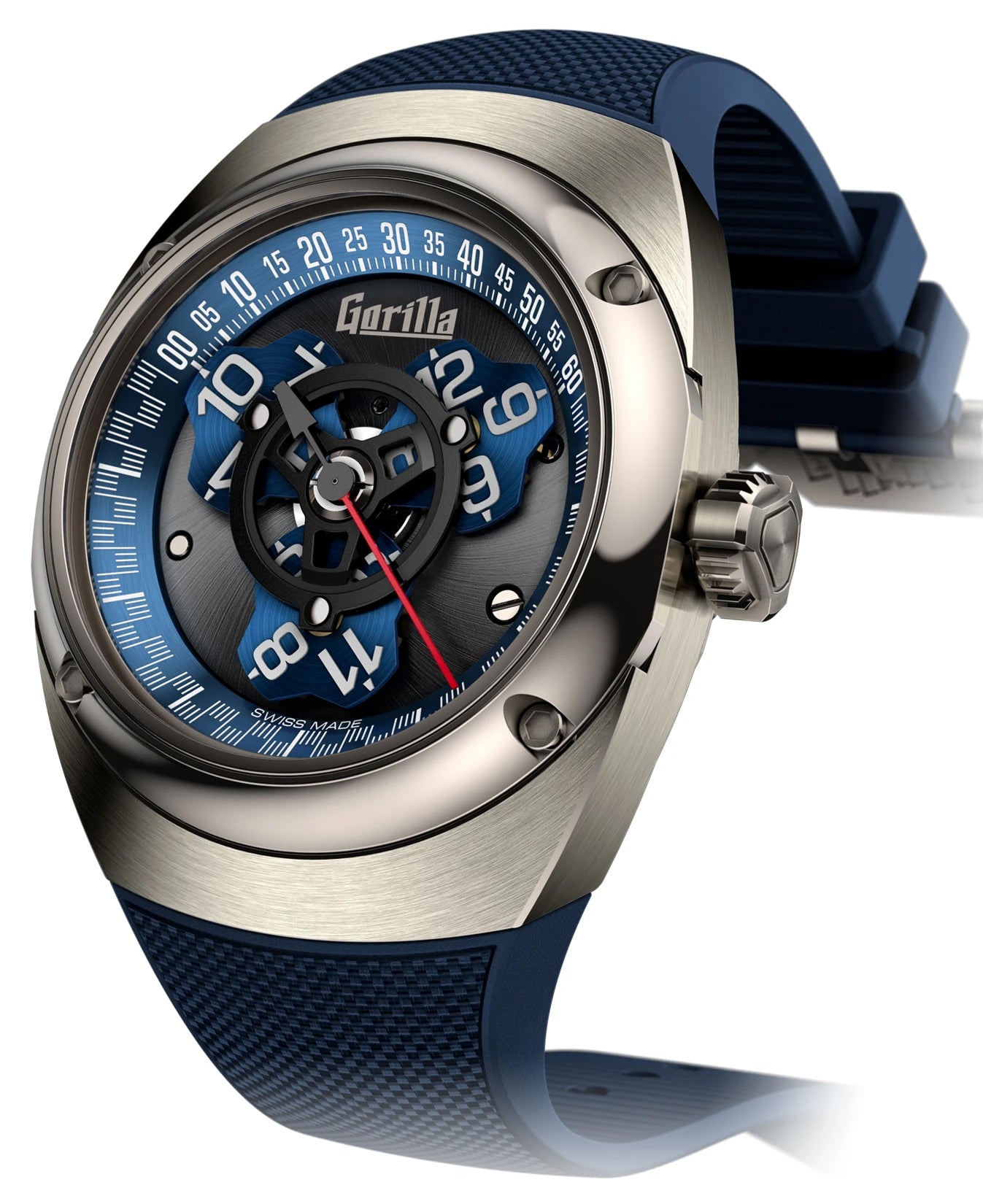 Gorilla Watch Outlaw Drift Limited Edition. Bridging past to future. The Outlaw Drift captures the vibrant design spirit of the 1970s, infused with the Gorilla signature design vocabulary. Interlocking flush in a series of dynamic curves, the mirror-polished concave bezel, and radial brushed case, are full-sculpted of grade 5 titanium and fastened by four corner allen head bolts. Pacific blue anodized aluminum flange and star satellites carry the hand-laid luminescent numerals and subdivisions, creating subtle contrast against the NAC plated snail milled baseplate. The retro futurist tonneaux silhouette of the Outlaw Drift is further emphasized by the perfectly tangent rubber & Cordura hybrid strap.