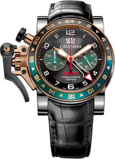 Graham Watch Chronofighter Oversize GMT Steel & Gold. Graham Watches, known as the father of the chronograph, George Graham was also the brains behind inventions such as the dead beat cylinder escapement, the first wall chronograph and the mercury pendulum. Perpetuating this spirit of remarkable innovations and technical expertise, Graham is now a contemporary watch brand dedicated to enthusiasts of the mechanical arts. Graham watches evoke a powerful fascination among connoisseurs with technically and aesthetically playful objects that combine originality, exclusivity and avantgarde. Based on inventive concepts determining design, functions and finish, the British brand made creates imposing wrist machines.