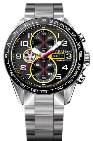 Graham Watch Silverstone Racing Red Yellow Bracelet 2STEA.B15A.A26F. Graham is an unrepentantly English name for an exquisitely English watch. If you're interested in the minutiae of watch making, Graham was the surname of George Graham, born in 1673, master watchmaker who lived in Fleet Street in London.
