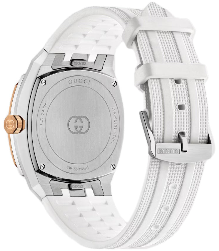 This Gucci 25H watch reference YA163439, however, imparts a relatively simple design focus. Its stainless steel case is unisex, measuring a diameter of 36mm and is integrated with 50 meter water resistance. Underneath a strong sapphire crystal glass front is a shimmering silver dial adorned with gold coloured hour markers and hands. The 12 o’clock location is represented by a Roman numeral, while the 3 o’clock location features a date window. The bezel is also executed in a gold coating to match the hands of the dial. This Gucci 25H watch is powered by a Swiss made movement and secures to the wrist with a white textured rubber strap for a sporty and comfortable finish.