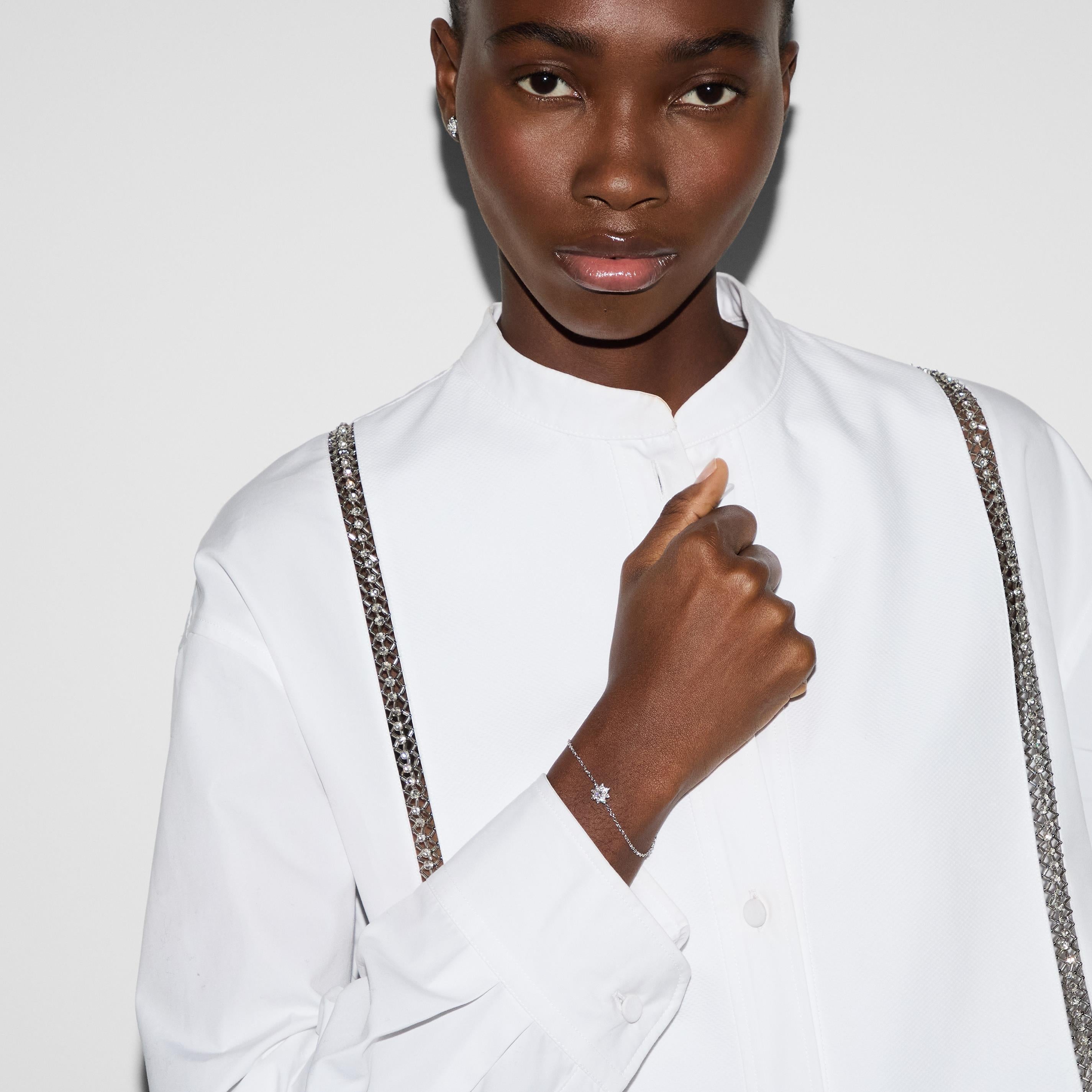 Feminine and sophisticated, the Flora line appears in all three 18k gold variations for Pre-Fall 2024. The delicate flower design is enriched with a pavé of diamonds across necklaces, bracelets, earrings, and rings for special occasions. This chain bracelet in white gold can be matched with other accessories from the same line.