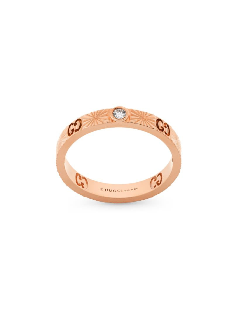 The latest silhouettes for the Icon line offer new refined and contemporary executions of signature pieces. Intricate engraved details offer a magical touch, such as the heart motif that continues to appear as a beloved symbol of the House alongside the emblematic GG motif. Here a precious white diamond enriches this 18ct rose gold ring. 1 diamond, totaling approximately 0.034ct. Width: 3mm.