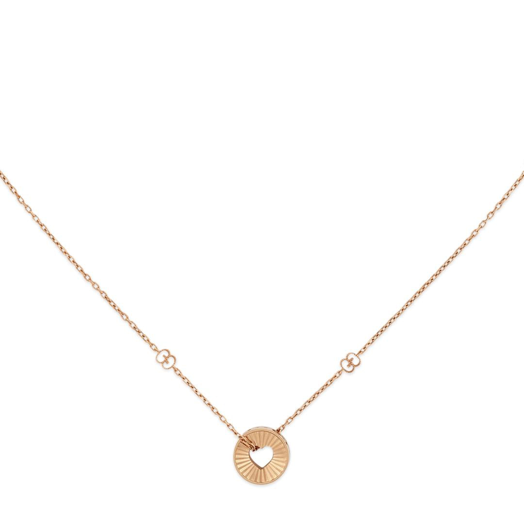 The latest silhouettes for the Icon line offer new refined and contemporary executions of signature pieces. Intricate engraved details offer a magical touch, such as the heart motif that continues to appear as a beloved symbol of the House alongside the emblematic GG motif. Here both symbols appear as part of this precious necklace in 18ct rose gold. Dimensions: 40cm length adjustable to 42cm.