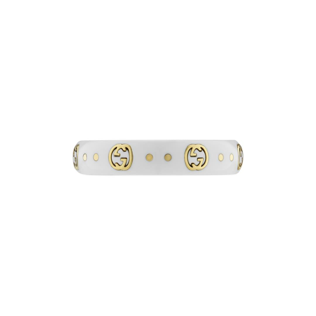 The Icon collection reprises one of the House's most emblematic motifs. The Interlocking G, representative of founder Guccio Gucci's initials, is presented in yellow gold, contrasting against a white synthetic corundum band. 18ct yellow gold and white zirconia. Interlocking G engraving in gold. Width: 4mm.