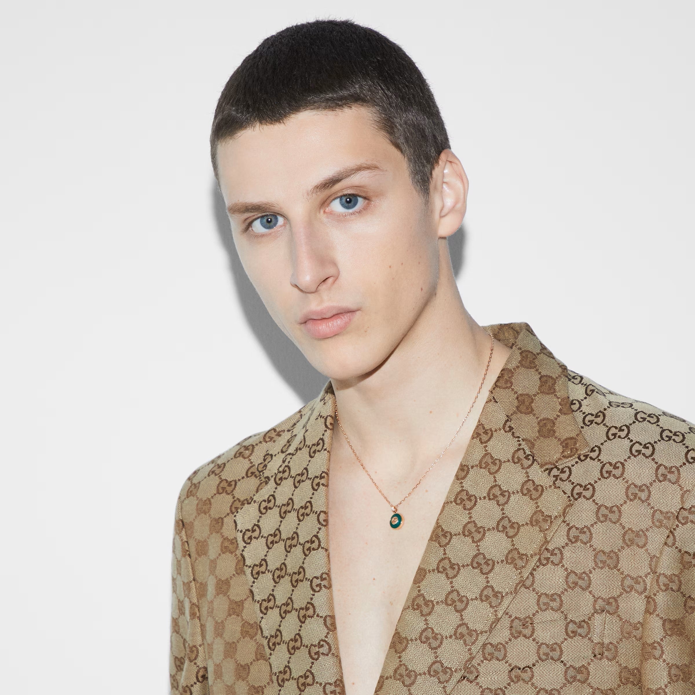 The Interlocking G logo appears in elegant new interpretations for Pre-Fall 2024. Refined rose gold is complemented by vivid green agate stone and sparkling diamonds. This adjustable chain necklace can be matched with other accessories from the same line.