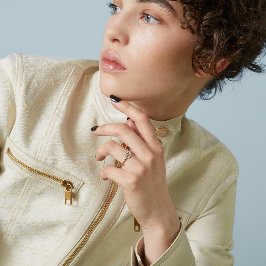 The Interlocking G jewellery collection takes a cue from the geometric logo, resulting in this ring design. Set with diamonds and crafted in 18ct white gold, this ring transitions effortlessly from day to evening.