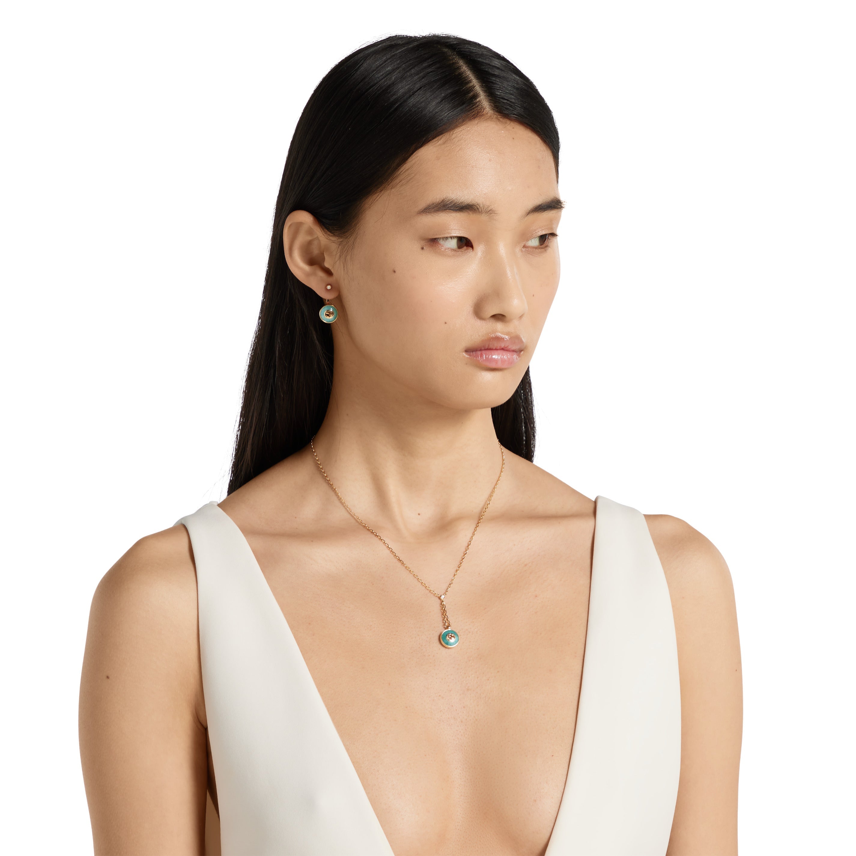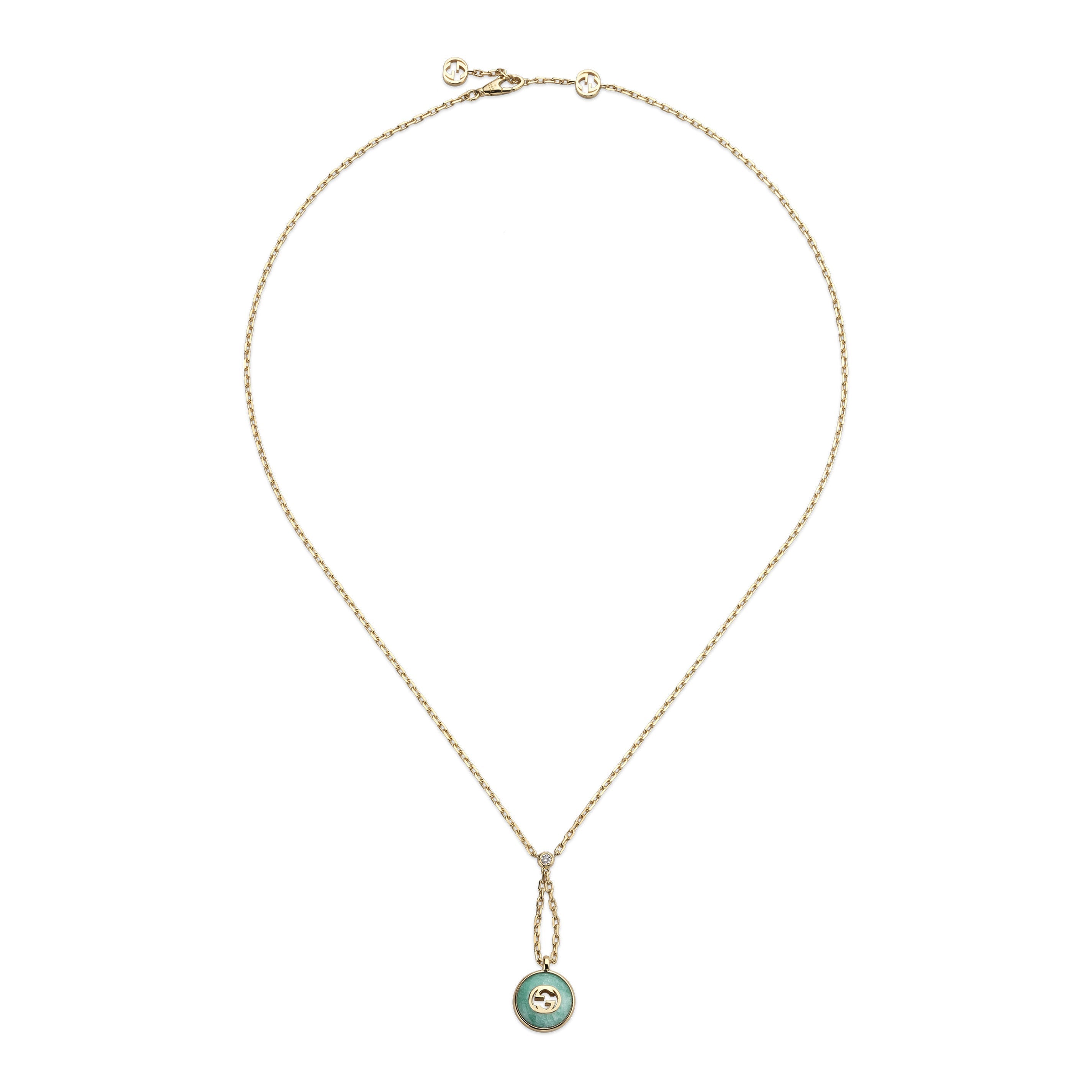 This necklace features an 18ct yellow gold chain with an interlocking G design, as well as a stunning amazonite and diamond pendant. Crafted by Gucci, this piece is a timeless, sophisticated addition to any jewellery collection.