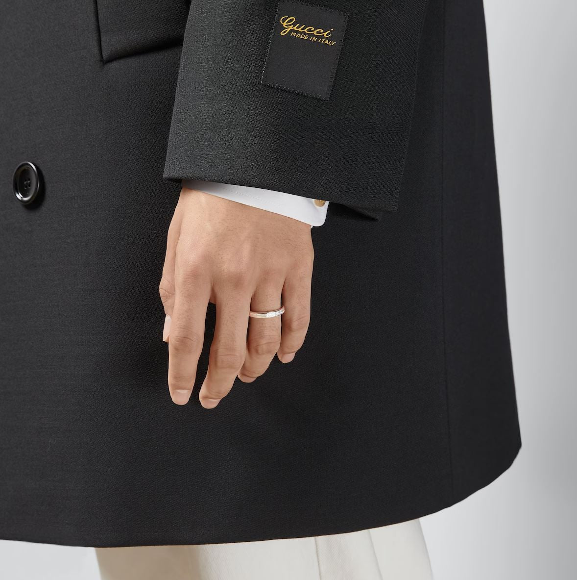 This season, the diagonal Interlocking G engraving appears on silver jewelry pieces such as tags, charms, and rings, while non-metal materials include GG Supreme, leather and fabric. This thin ring is crafted from 925 sterling silver with a diagonal Interlocking G engraving.