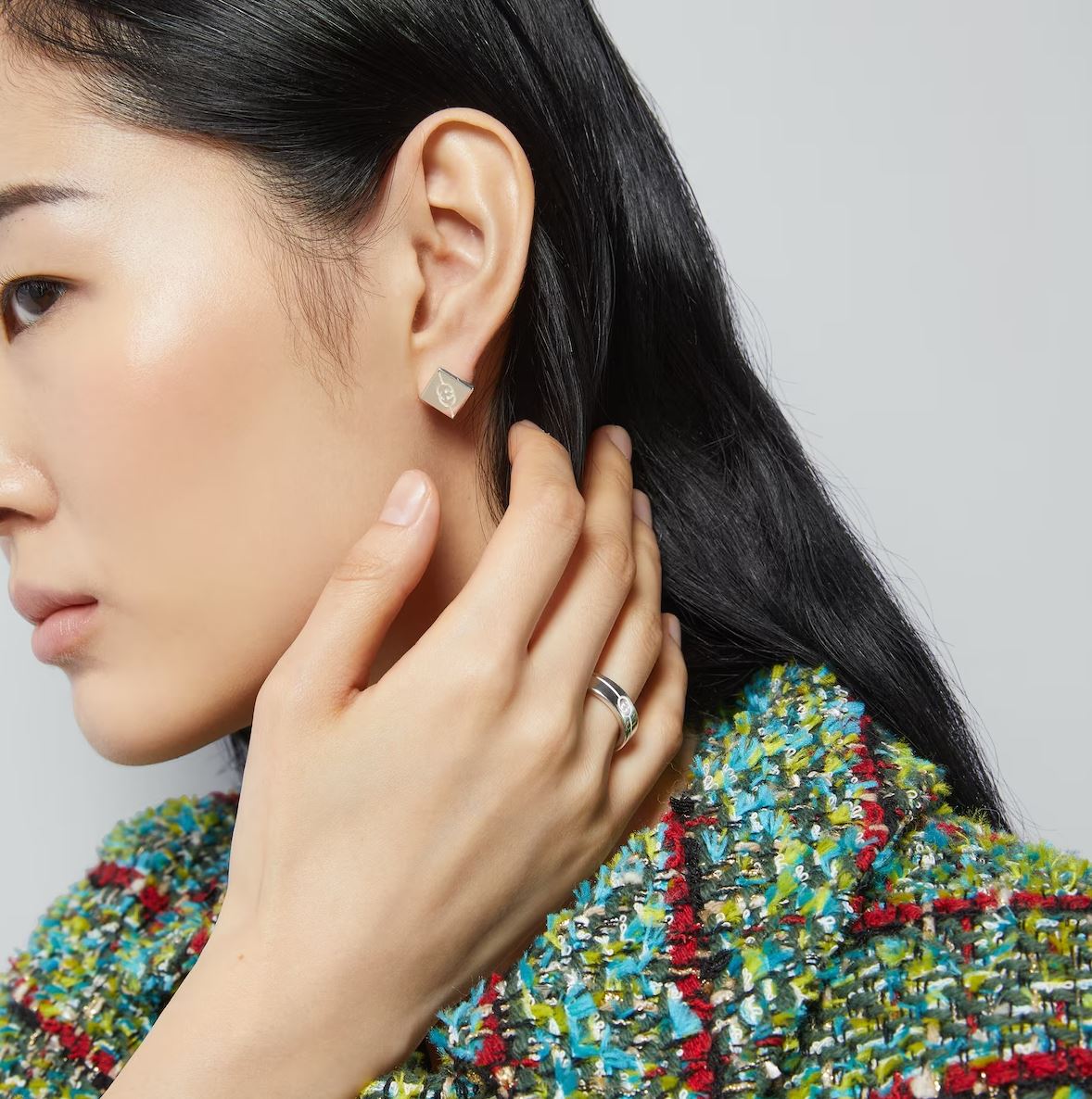 This season, the diagonal Interlocking G engraving appears on silver jewelry pieces such as tags, charms, and rings, while non-metal materials include GG Supreme, leather and fabric. This ring is crafted from 925 sterling silver with a diagonal Interlocking G engraving.