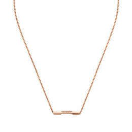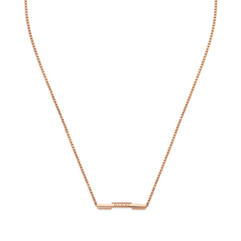 The Link to Love collection from Gucci explores modern romance and characterizes new symbols of love. This 18ct rose gold pendant necklace features Gucci engraved on the bar pendant that hangs from an adjustable 42-45cm chain.