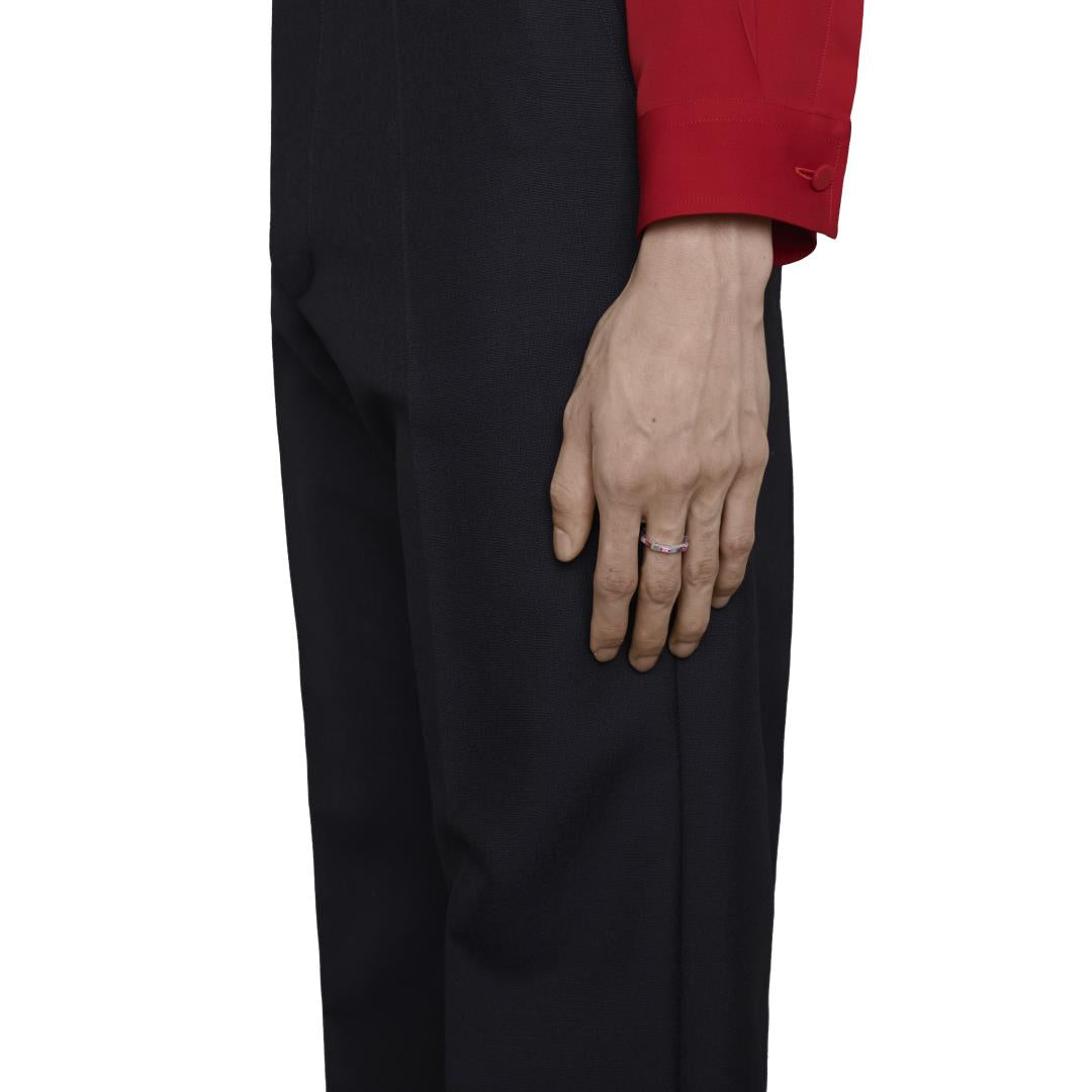The Gucci Link to Love collection is an exploration of modern romance characterizing new symbols of love. The collection combines different gold tones and a mix of finishes blending the lines between masculine and feminine. Each piece is meant to inspire individualized ways to wear them with stackable and layered features. This 18ct white gold striped ring has a stackable mechanism and baguette cut pink rubellite. 8 gemstones, totaling approximately 0.90ct. Band width: 2mm.