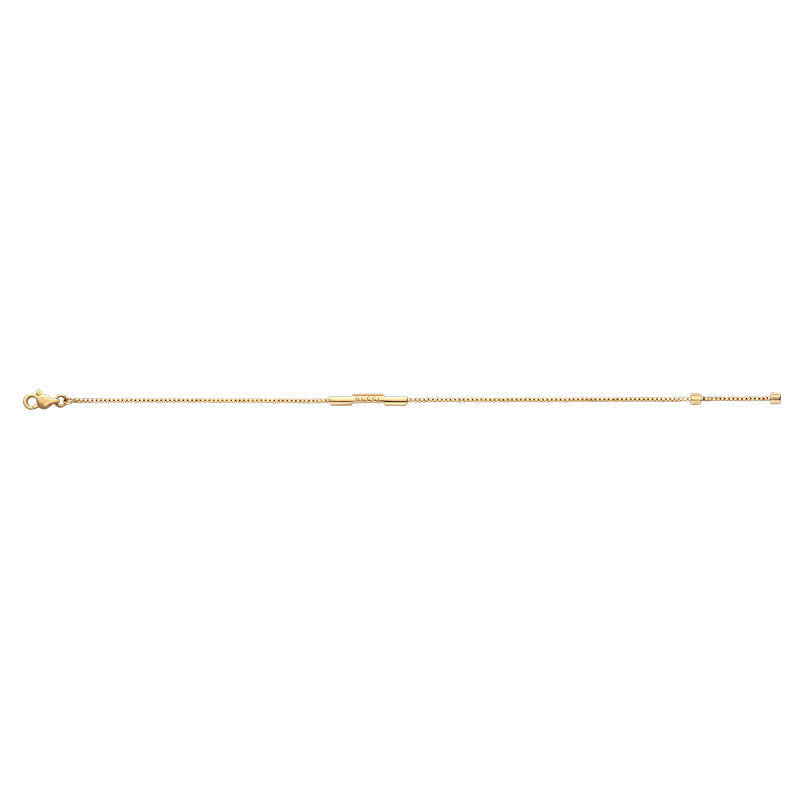 The Link to Love collection from Gucci explores modern romance and characterizes new symbols of love. This 18ct yellow gold bracelet features Gucci engraved on the bar pendant.