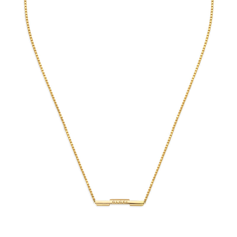 The Gucci Link to Love collection is an exploration of modern romance characterizing new symbols of love. The collection combines different gold tones and a mix of finishes blending the lines between masculine and feminine. Each piece is meant to inspire individualized ways to wear them with stackable and layered features. This 18ct yellow gold necklace has a 'Gucci' engraving on the bar pendant. Adjustable clasp closure.