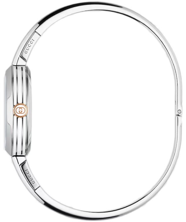 This Gucci Model 2000 watch reference YA167513 is crafted from stainless steel and features a dainty circular case measuring a diameter of 24mm. Inside the case is a quartz movement, which propels a set of rose gold coloured hands around the dial with ease. Matching these indulgent rose gold colours is a rose gold band with silver studded decoration, surrounded by a ripple patterned silver outer section. Gucci also equips this dial with a mix of Roman numeral hour markers and the Interlocking G motif. To finish, the watch features a slim steel bangle strap, evoking a jewellery-like finish.