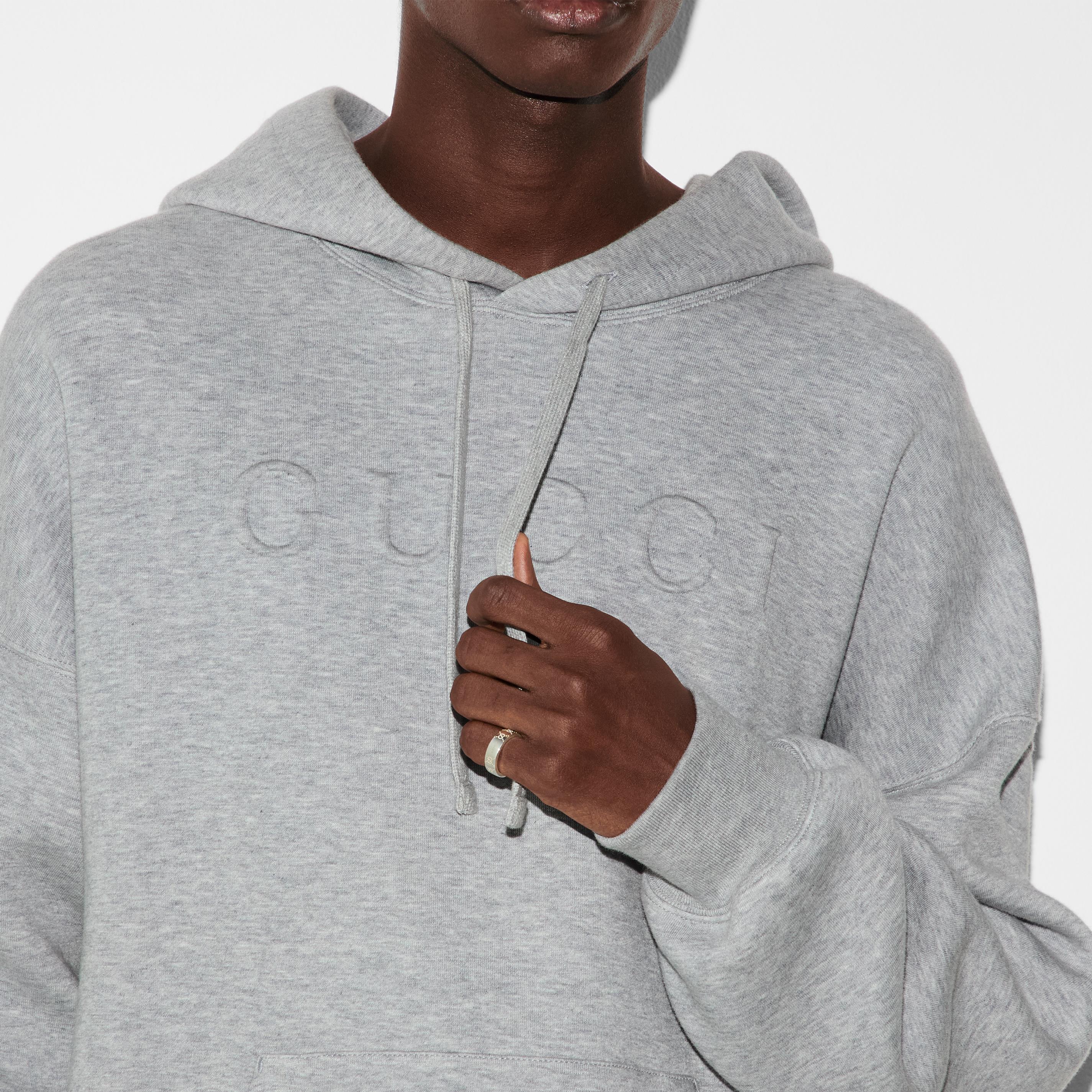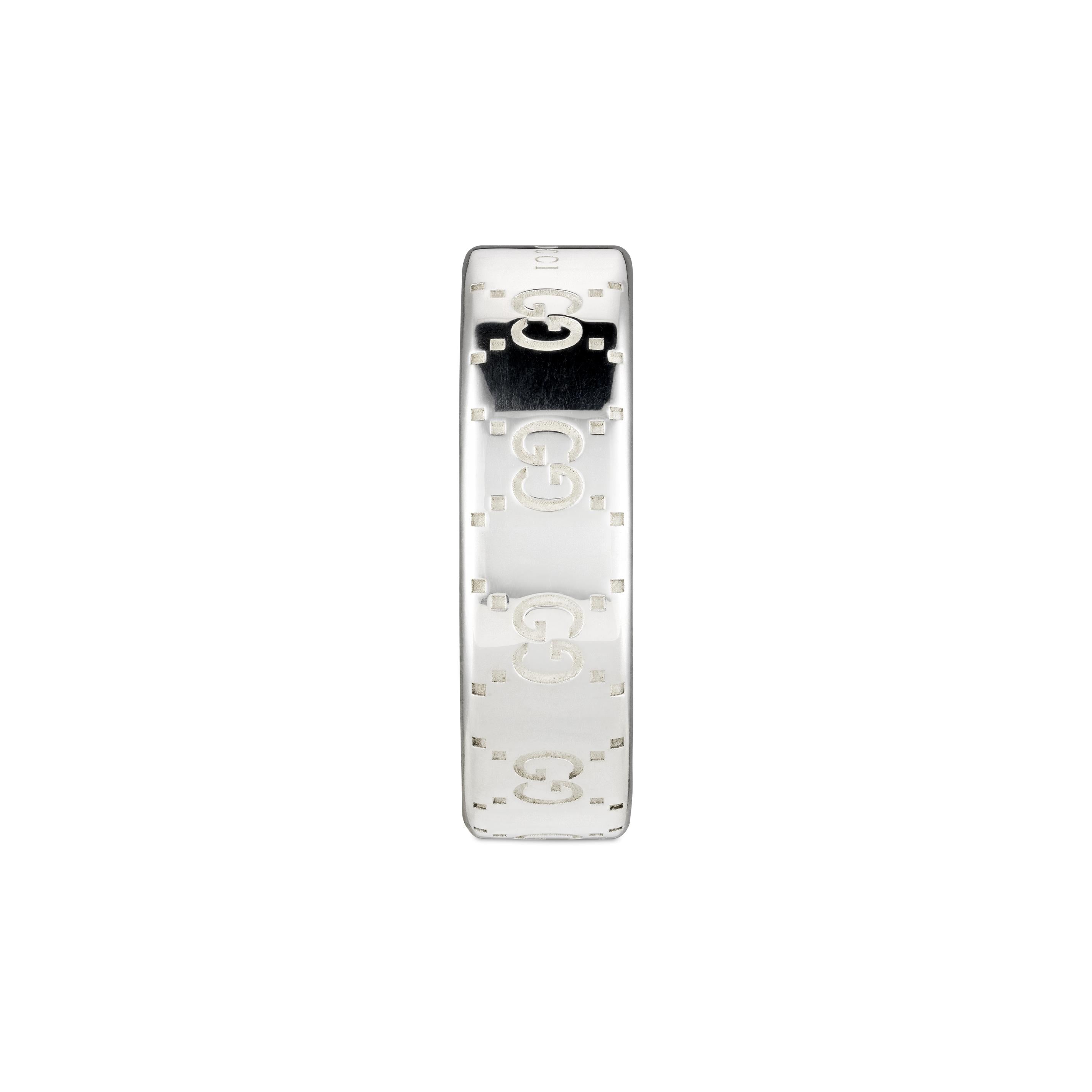 The GG motif returns atop a selection of everyday pieces with a contemporary feel and easy-to-wear attitude. The engraved logo and dots design decorates the shiny sterling silver base, covered with a coating technique to reduce oxidation. Here it decorates a classic wide ring.