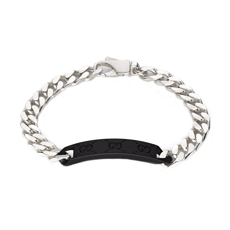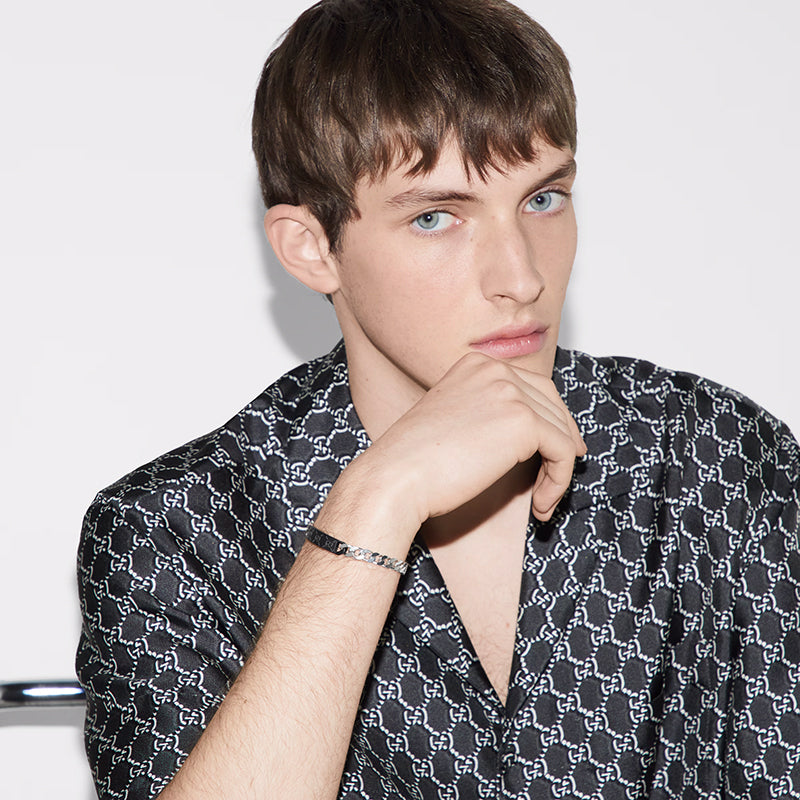 Gucci revives its trademark logo atop silver and enamel oval tags, recalling the 1990s' tag necklaces and bracelets with a refined touch. Variations in rubber, with the GG motif, offer an everyday alternative to the jewellery line.