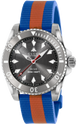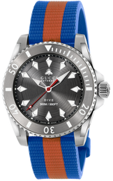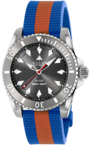 Gucci Watch Dive 40mm YA136352. A new introduction to the Dive family, the watch combines the House symbolic elements: the Web stripe and the Gucci bee. Designed with a steel case and a steel bezel, the accessory is defined by a dark grey dial featuring the emblematic bee motif. A blue and brown rubber Web strap completes the style.
