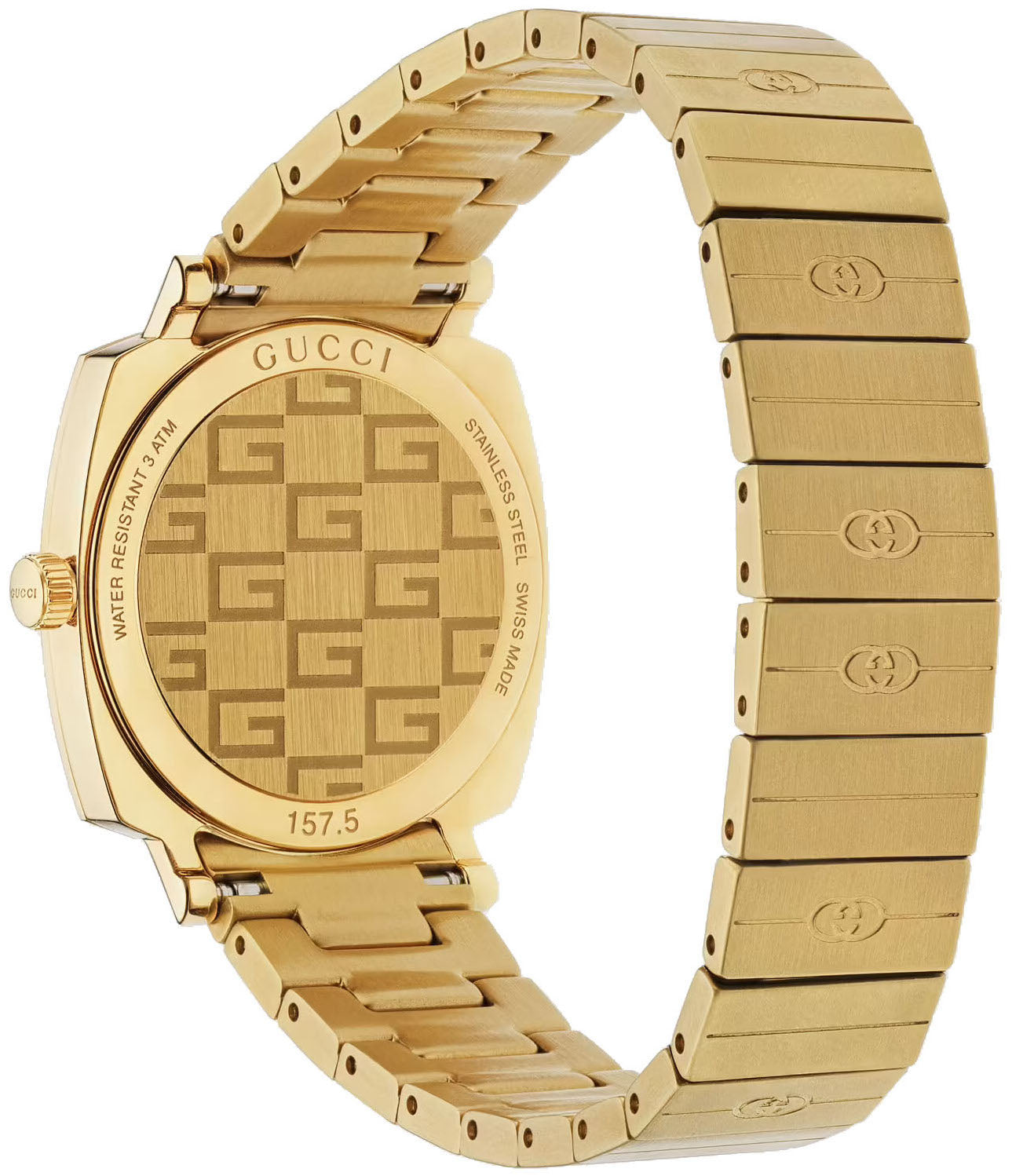 Gucci Watch Grip Ladies YA157502. Combining Italian flair with Swiss craftsmanship, Gucci watches have effortlessly ascended to the very pinnacle of the hierarchy for luxury and fashion watches. Their modern and romantic designs have become renowned around the globe for taking a fashionable and bold step ahead of every other designer, always anticipating the industry’s next eye catching trend.