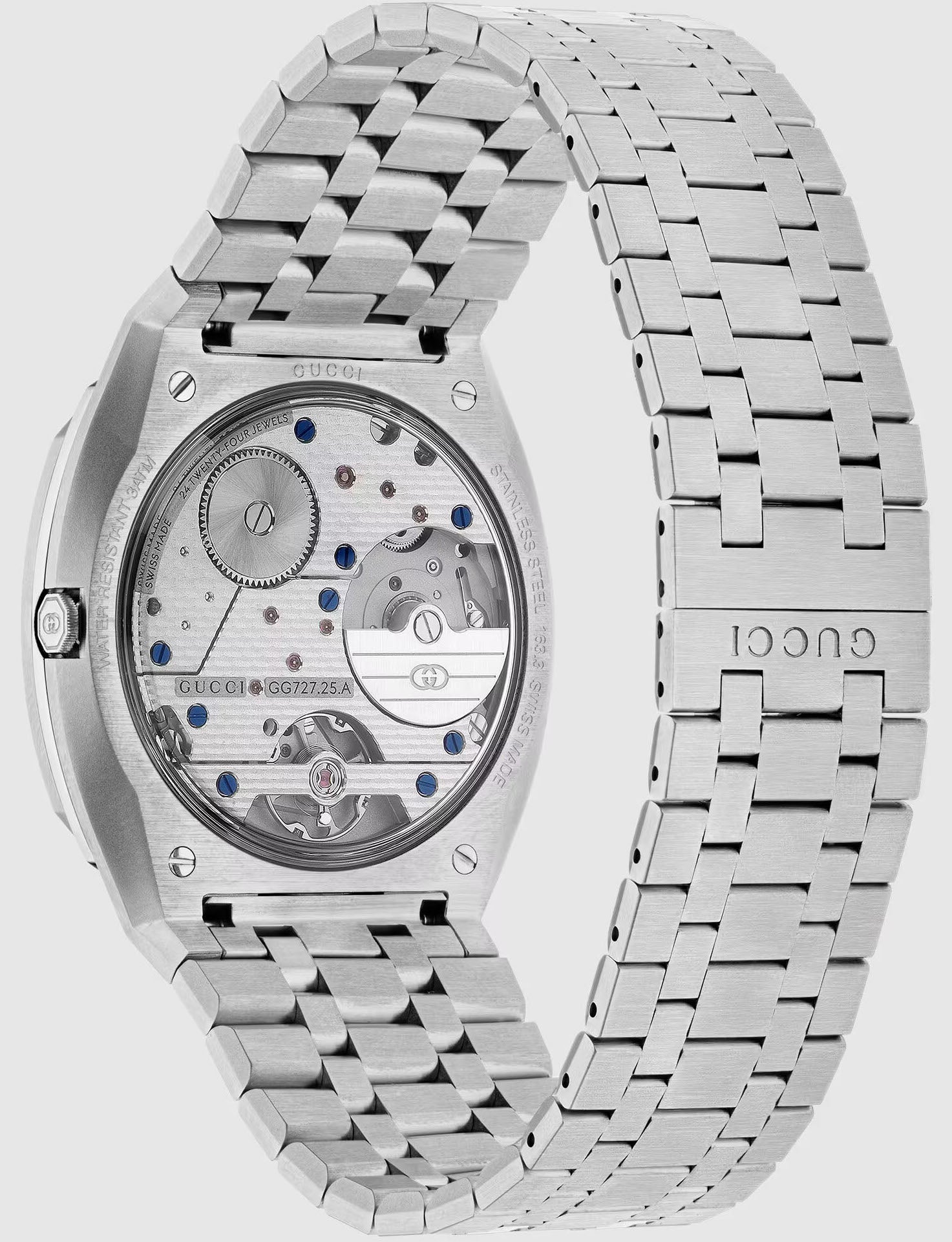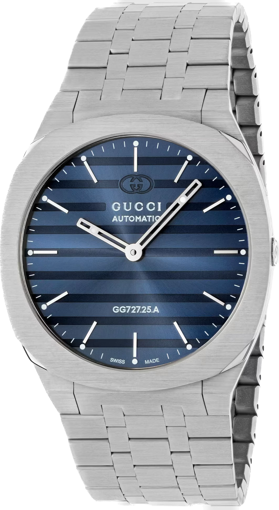A milestone in Gucci's Swiss watchmaking history, this automatic style is fitted with the first in-house GG727.25. A caliber, with sleek bezel and contemporary architectural details.