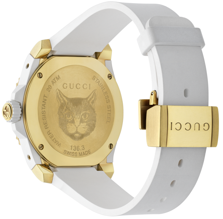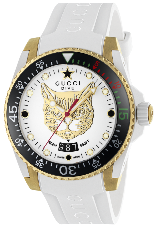Gucci Watch Gucci Dive Ladies YA136322. Combining Italian flair with Swiss craftsmanship, Gucci watches have effortlessly ascended to the very pinnacle of the hierarchy for luxury and fashion watches. Their modern and romantic designs have become renowned around the globe for taking a fashionable and bold step ahead of every other designer, always anticipating the industry’s next eye catching trend.