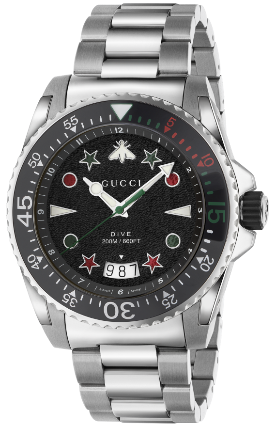 Gucci Watch Gucci Dive Mens YA136221. Combining Italian flair with Swiss craftsmanship, Gucci watches have effortlessly ascended to the very pinnacle of the hierarchy for luxury and fashion watches. Their modern and romantic designs have become renowned around the globe for taking a fashionable and bold step ahead of every other designer, always anticipating the industry’s next eye catching trend.