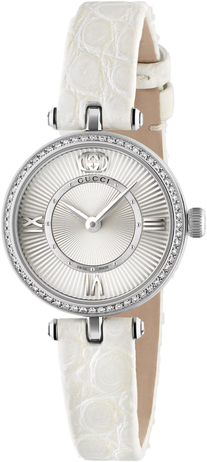 This Gucci Model 2000 watch reference YA167502 features a stainless steel case measuring a diameter of 24mm and a sumptuous silver dial adorned with the collection’s signature ripple effect on the outer section. This three dimensional effect has been combined with faceted hands and beautifully carved Roman numeral hour markers underneath a sapphire crystal glass front. The Gucci lettering is also present across the dial, as is the Interlocking G motif, all of which are framed by scintillating diamonds set into the bezel. This quartz powered watch is fitted on a white alligator leather strap to complete its resolutely feminine design.