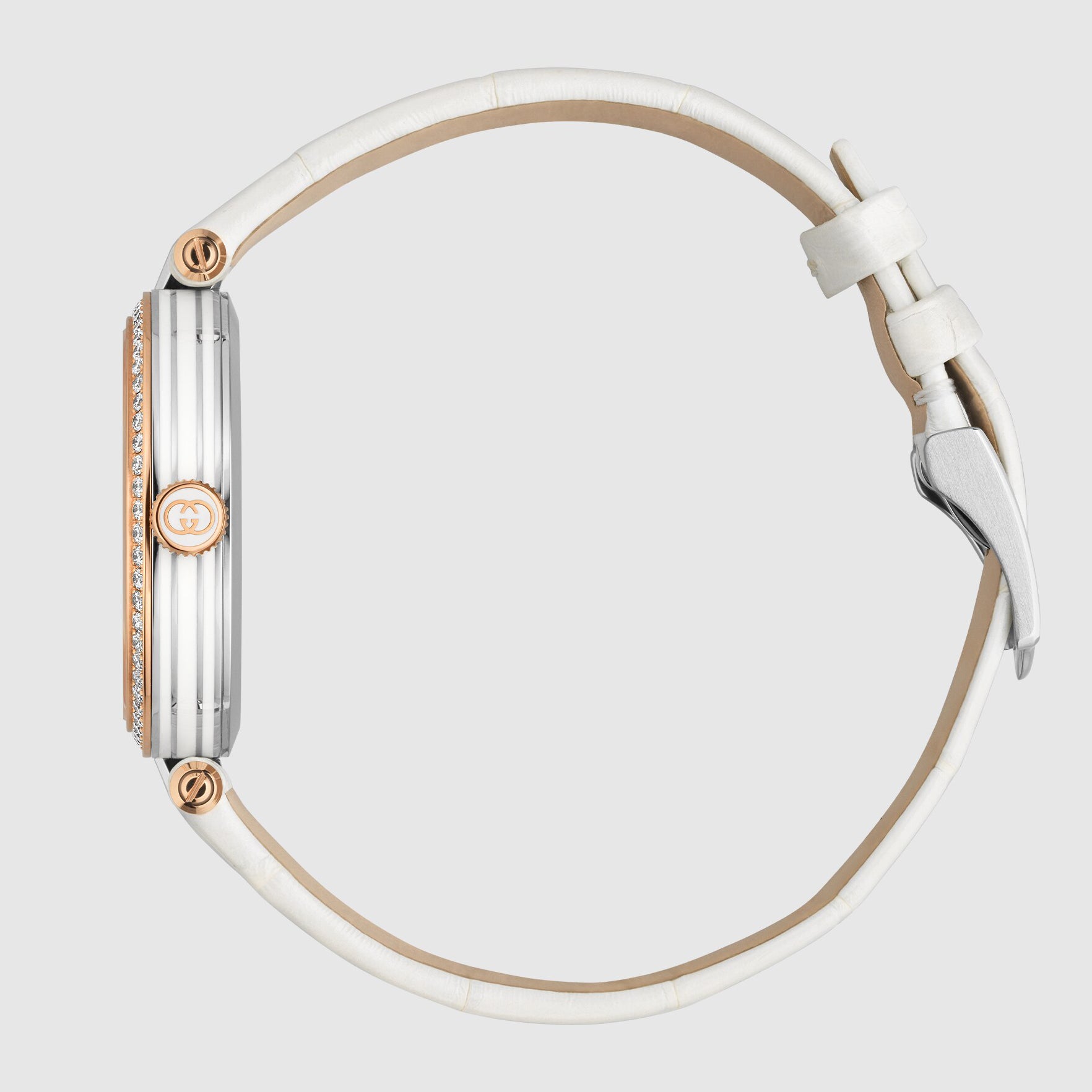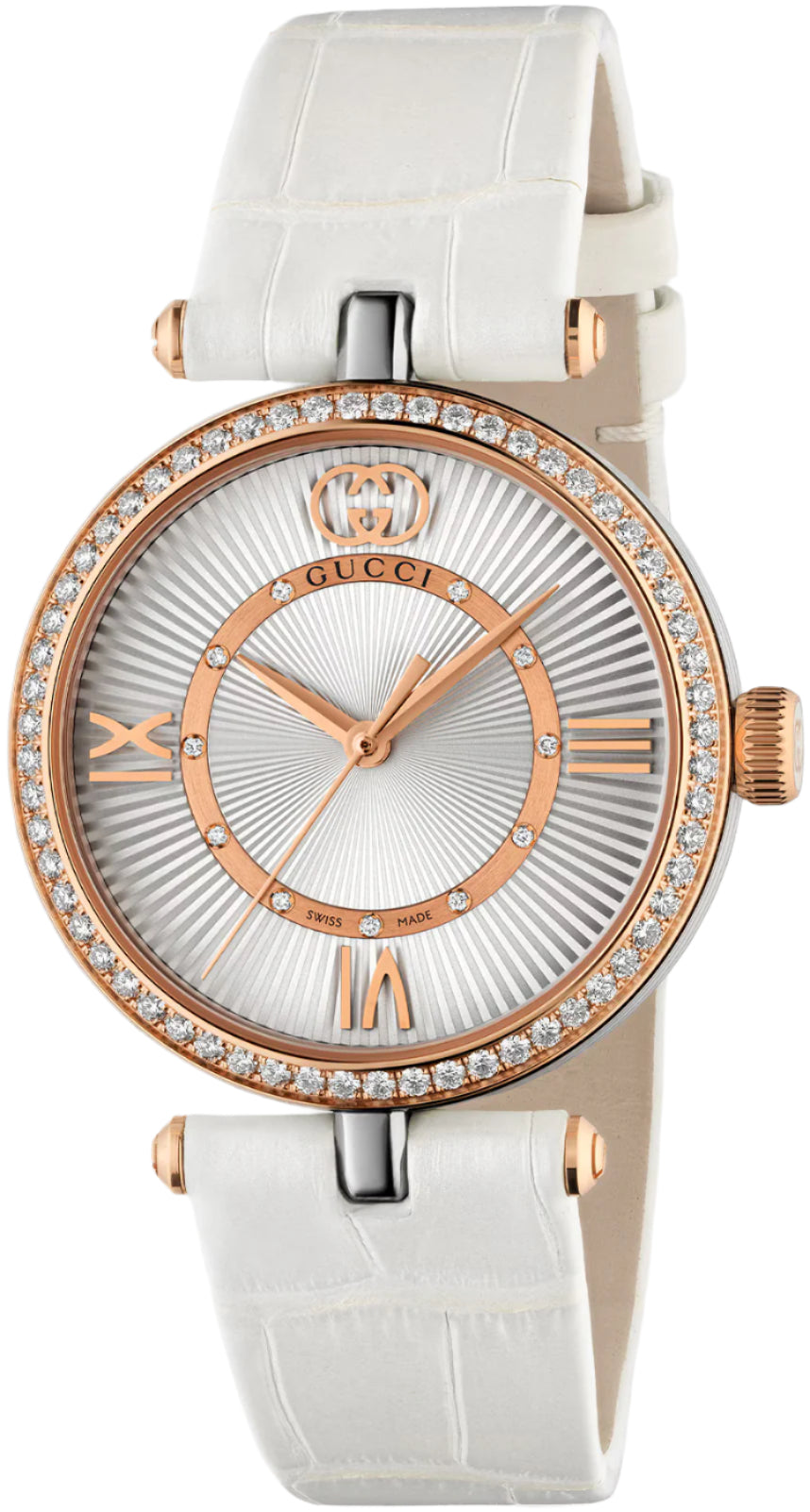 This Gucci Model 2000 watch reference YA167509 is crafted from stainless steel and measures a diameter of 30mm. A rose gold PVD coated finish has been applied to the crown and the dazzling bezel, which has been set with an array of round brilliant cut diamonds. On the dial itself, more rose gold accents continue into the hands and the Roman numerals. An inner band of rose gold has also been adorned with diamond detailing, while the Interlacing G motif at 12 o’clock and the silver ripple effect outer section add further detail to the design. Gucci experts equip this Model 2000 watch with a quartz movement and fit it with a classic white alligator leather strap to complete its ultra feminine look.