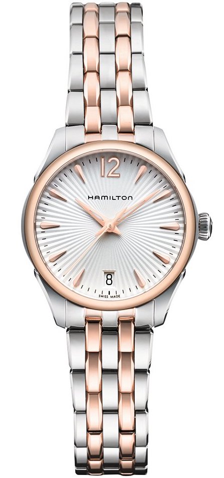 Hamilton Watch Jazzmaster Lady Quartz H42221155. The simple, unassuming style of the Jazzmaster Lady creates an image of grace, poise and class. Available in 27mm, 30mm and 34 mm case size, these Quartz timepieces are offered in varying bracelet and strap colors and styles. Dials are available in black, white and mother of pearl with several models offering the option of diamond accents.